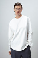 A relaxed essential crafted from solid organic cotton. Designed with dropped shoulders and relaxed silhouette, this long-sleeve top offers comfort and quiet sophistication for everyday wear. Finished with a subtle tone-on-tone FLOW monogram embroidered on the back — a discreet nod to the brand’s signature understated aesthetic.