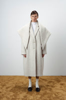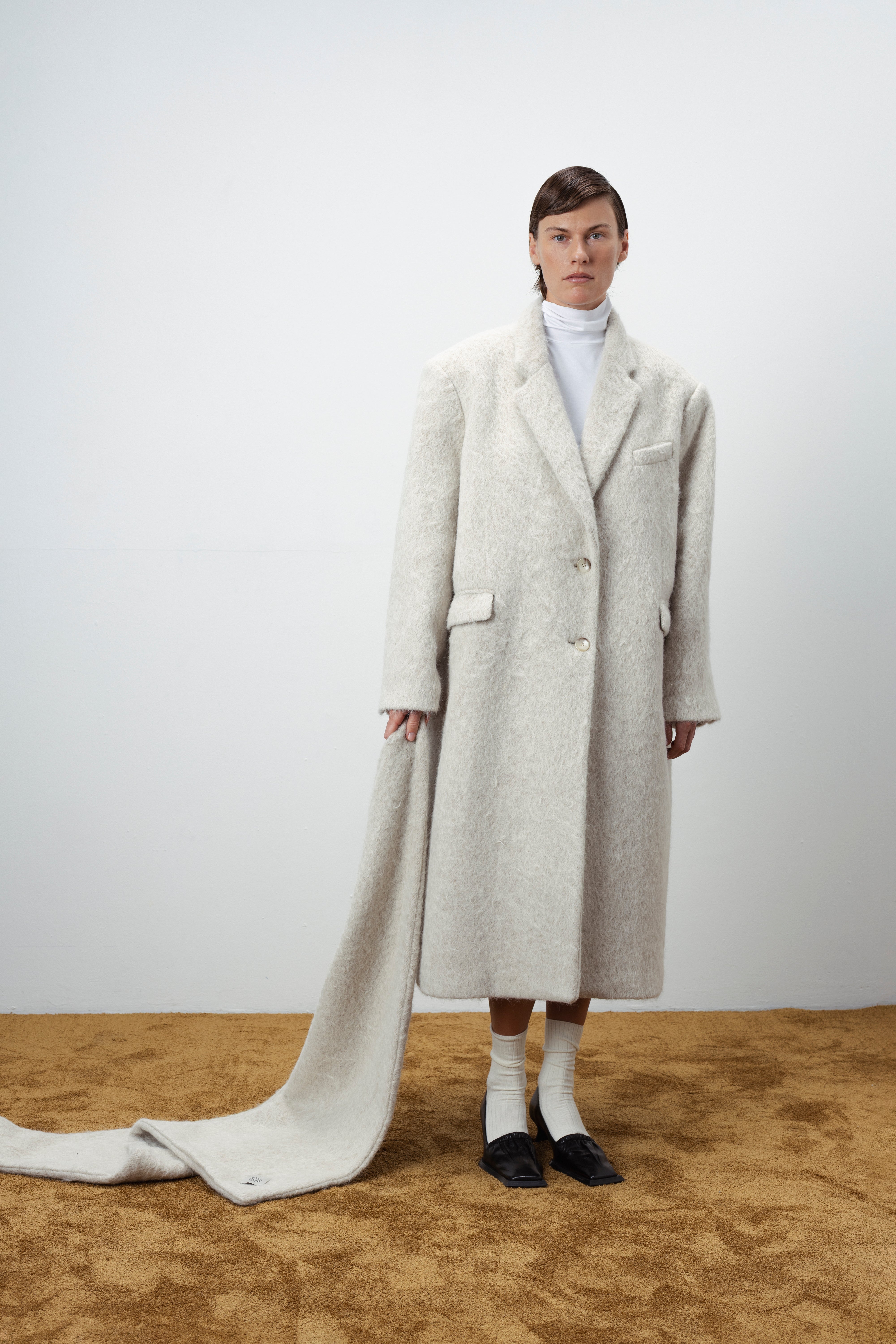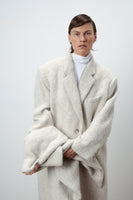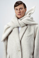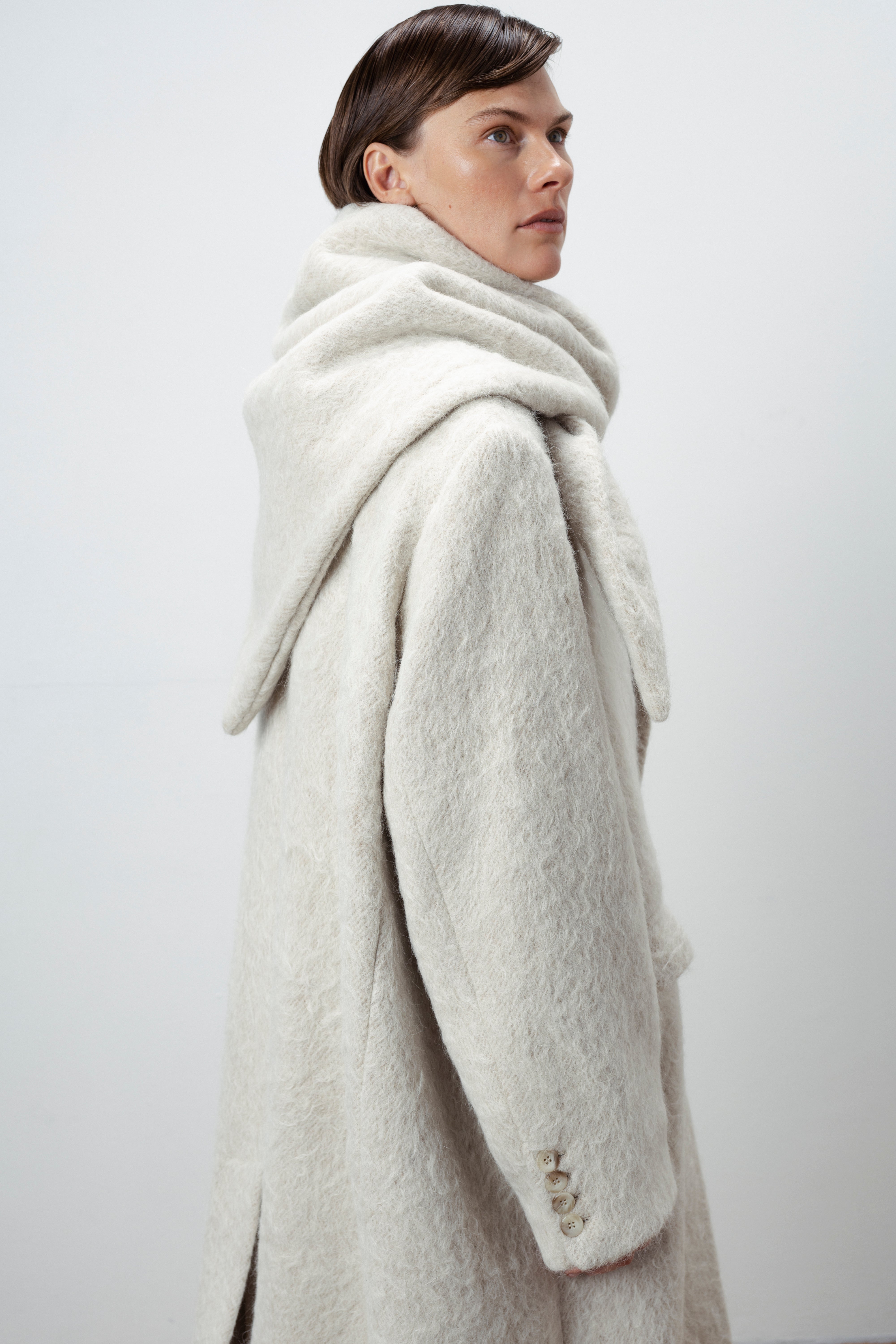 A statement of comfort and form — timeless, architectural, and deeply sensual in its simplicity, designed for warmth and ease. This FLOW FEMME AW collection oversized coat is crafted from 100% hairy wool, creating a soft, tactile texture with a sculptural presence. It comes with a matching scarf in the same milky shade — a piece that can be wrapped for a layered, cocoon-like look.